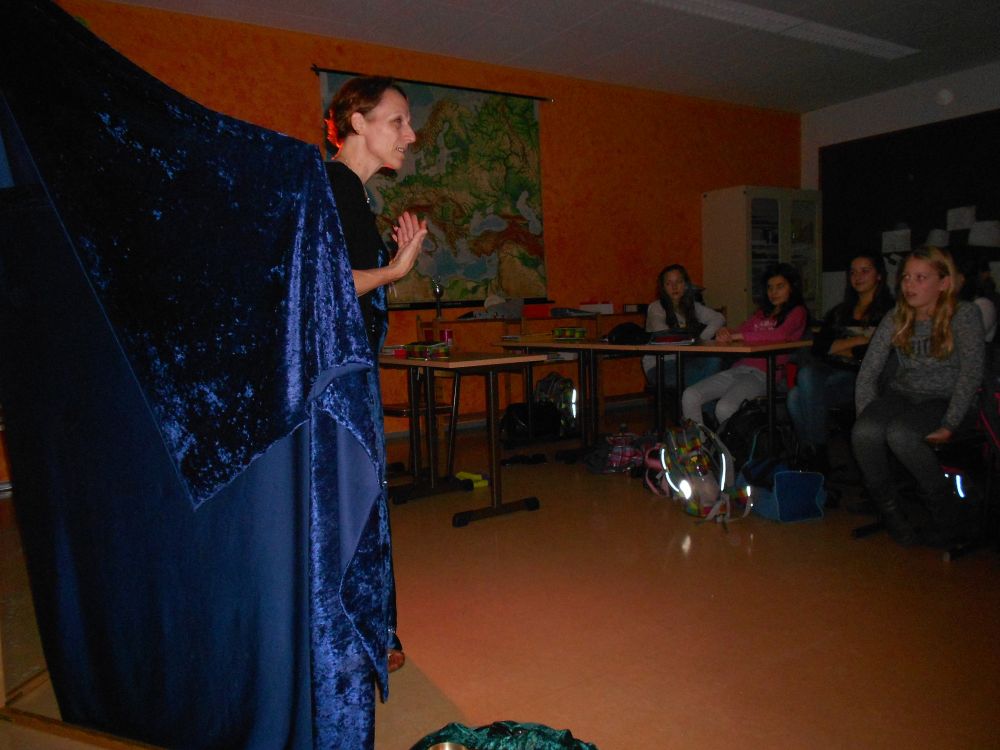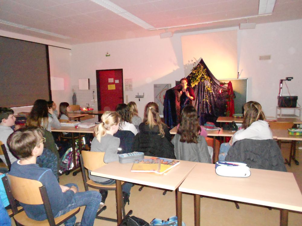 Kurz vor Weihnachten war wieder Märchenzeit am Caspar-Mohr-Progymnasium. Ute Bodenmüller, Schulsozialarbeiterin am Schulzentrum Bad Schussenried und leidenschaftliche Märchenerzählerin, besuchte die Klasse 6 und erzählte den Schülerinnen und Schüler verschiedene Märchen, die sie geschickt in eine Rahmenerzählung verpackt hatte. Gebannt lauschten die Jungen und Mädchen der Erzählung und ließen sich vor Märchenhafter Kulisse bereitwillig in die Märchenwelt entführen…