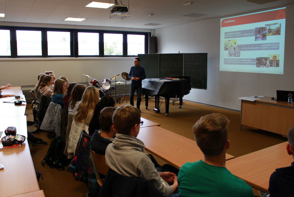 Wie dieser Weg weitergehen könnte, stellte Herr Kern im Anschluss vor. Dabei ging er neben dem von den Schülern mehrheitlich angestrebten Weges zum Abitur über ein allgemeinbildendes Gymnasium auch auf die alternative Berufsausbildung ein. Außerdem erläuterte er verschiedene Studienwege und charakterisierte die unterschiedlichen Hochschulformen (Uni, Fachhochschule, pädagogische Hochschule und die dualen Studiengänge sowie das berufsbegleitende Studium).