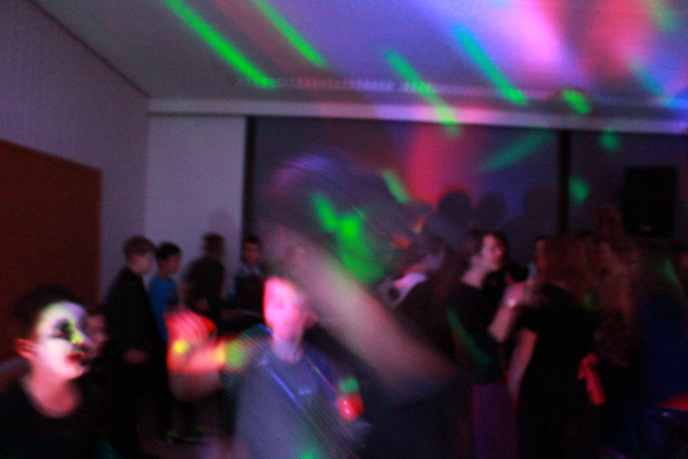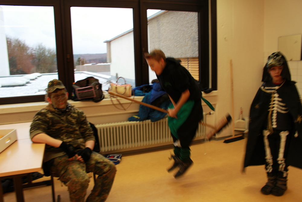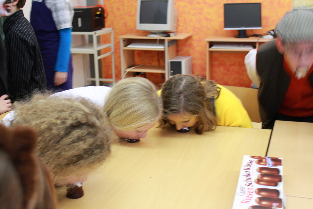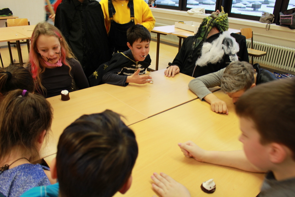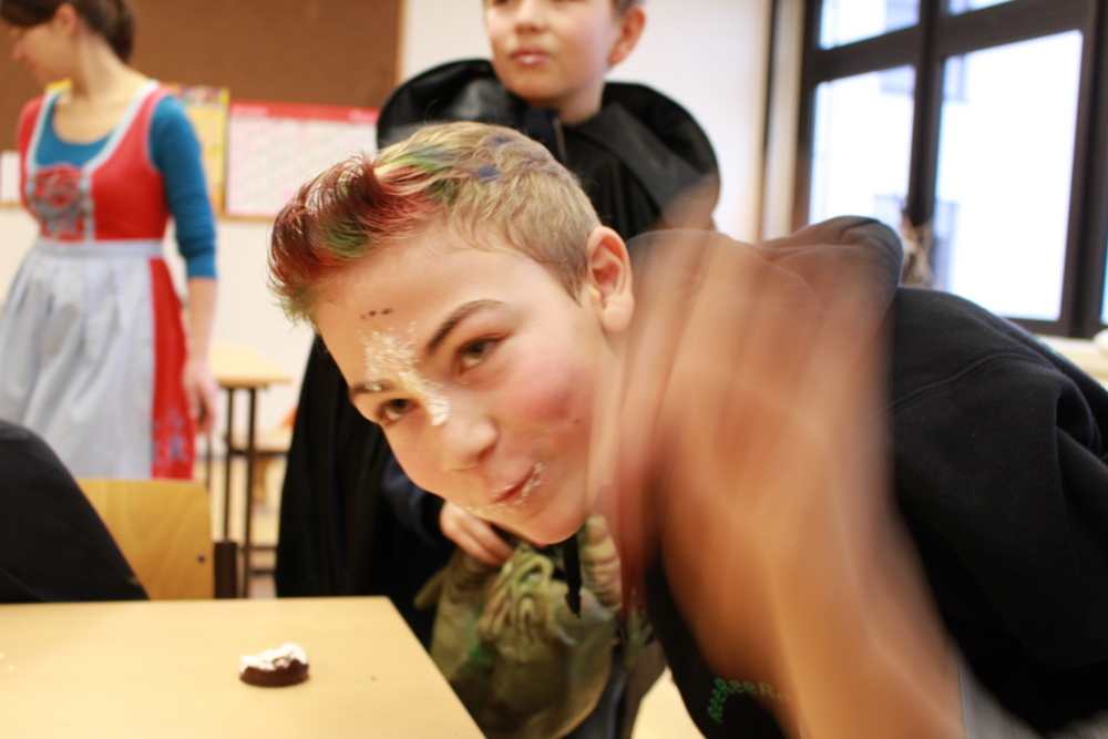 Nicht nur die Anwesenden, auch das Schulgebäude war für diesen Tag verhext worden und so war an Unterricht natürlich nicht zu denken. Stattdessen luden gleich zwei Partyräume zum Tanz ein und sorgten für gute Stimmung. Wer eine Stärkung benötigte, kam auch nicht zu kurz, denn die Klasse 8 hatte vorgesorgt und verkaufte leckere selbst gebackene Kuchen, Kekse und Getränke. Gerne wurde auch der Spieleraum genutzt, wo es viel zu lachen gab. Beim Schokoladen-Wettessen kam so manch einer richtig in Fahrt. Und auch das beliebte Schokokuss-Wettessen – ohne Hände, versteht sich – durfte wie jedes Jahr nicht fehlen.