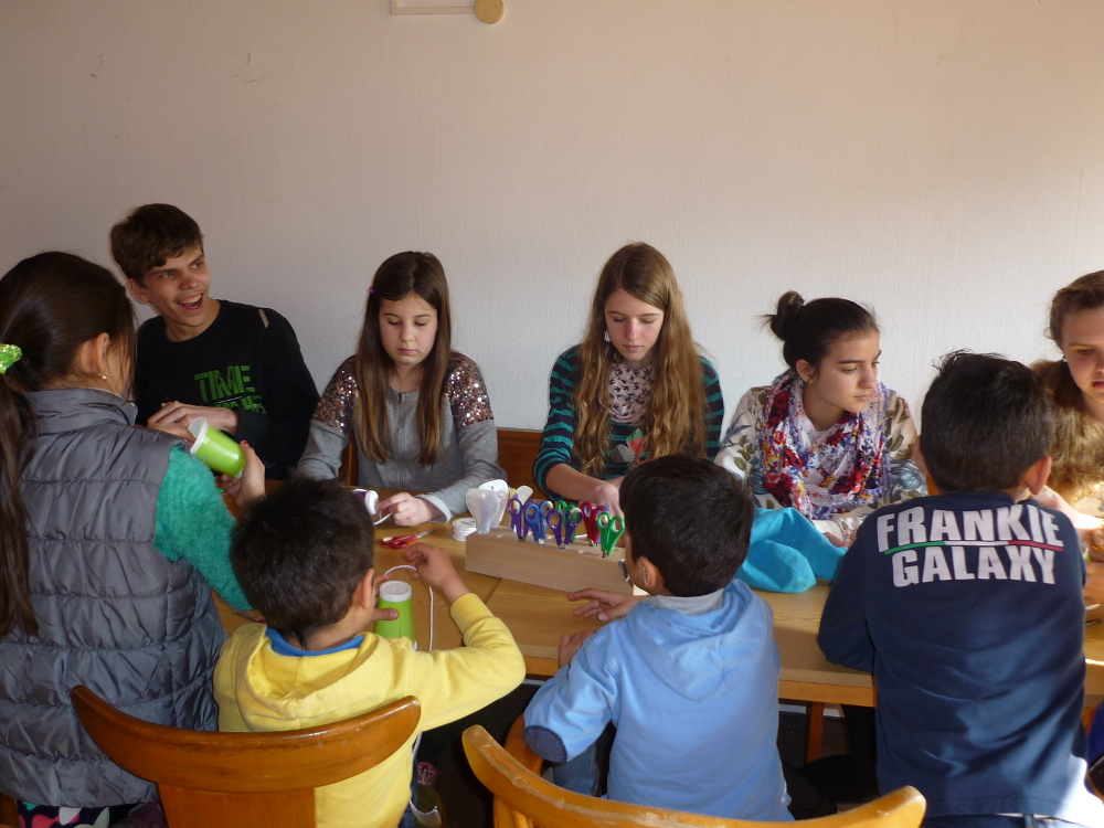 Zunächst wurden Namensschilder gebastelt, die sich die Kinder anschließend mit Sicherheitsnadeln anstecken konnten. Dabei durfte ausgeschnitten, bemalt, beschriftet und beklebt werden. Selbst die Kleinsten waren schon begeistert mit von der Partie, auch wenn sie beim Schreiben ihres Namens noch Hilfe benötigten. Überhaupt fielen den SMV-Schülern sofort die Offenheit und das Interesse der Kinder auf, die gleich begeistert mitmachten. Nachdem jeder sein Namensschild fertig gestaltet und angesteckt hatte, wurde mit Hilfe eines Balls ein Kennenlernspiel gespielt. Dies konnte bei strahlendem Sonnenschein im Garten der Flüchtlingsunterkunft geschehen. Anschließend ging es dann wieder zurück in den Aufenthaltsraum der Unterkunft, denn es sollte noch einmal etwas gebastelt werden. Dieses Mal sollte es etwas sein, mit dem die Kinder dann auch spielen und ihre Geschicklichkeit trainieren könnten. Das SMV-Team erklärte den Kindern, wie sie mit Hilfe eines Bechers, einer Schnur und eines Korken einen Fangbecher herstellen konnten. Interessiert schauten alle zu, wie die Schüler das Spiel vorführten und nachdem jeder seinen Becher beklebt und bearbeitet hatte, wurde erst einmal das Auffangen des Korken geübt. Schließlich blieb noch Zeit für zwei weitere Spiele: „Die Reise nach Jerusalem“, das den älteren Kindern schon bekannt war, und „der Fuchs geht um“. Auch die Schüler der SMV spielten mit und es wurde dabei viel gelacht. So war die Zeit wie im Flug vergangen und die Schüler des CMPG mussten sich schon wieder verabschieden. Alle hatten so viel Spaß an dem gemeinsamen Spielenachmittag, dass die Aktion womöglich keine einmalige Sache bleiben wird. Die SMV kann so einen wichtigen Beitrag dazu leisten, die Flüchtlinge in Bad Schussenried willkommen zu heißen und bei der Integration zu unterstützen. Besonders hervorzuheben ist vor allem auch die Zielstrebigkeit und Selbstständigkeit, mit der das Sozialteam der SMV die Aktion vorbereitete und durchführte. Geplant ist nun auch ein Spendenkonzert, das im Juli stattfinden soll.