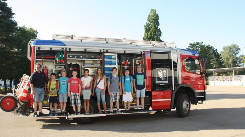 Bei der Jugendfeuerwehr bekamen die Schüler von Herrn Widmann einen theoretischen Einblick in die Arbeit der Feuerwehr, sowie praktische Eindrücke beim Löschen eines kleinen, kontrollierten Feuers sowie beim Erklimmen der Drehleiter des Feuerwehrfahrzeugs.
