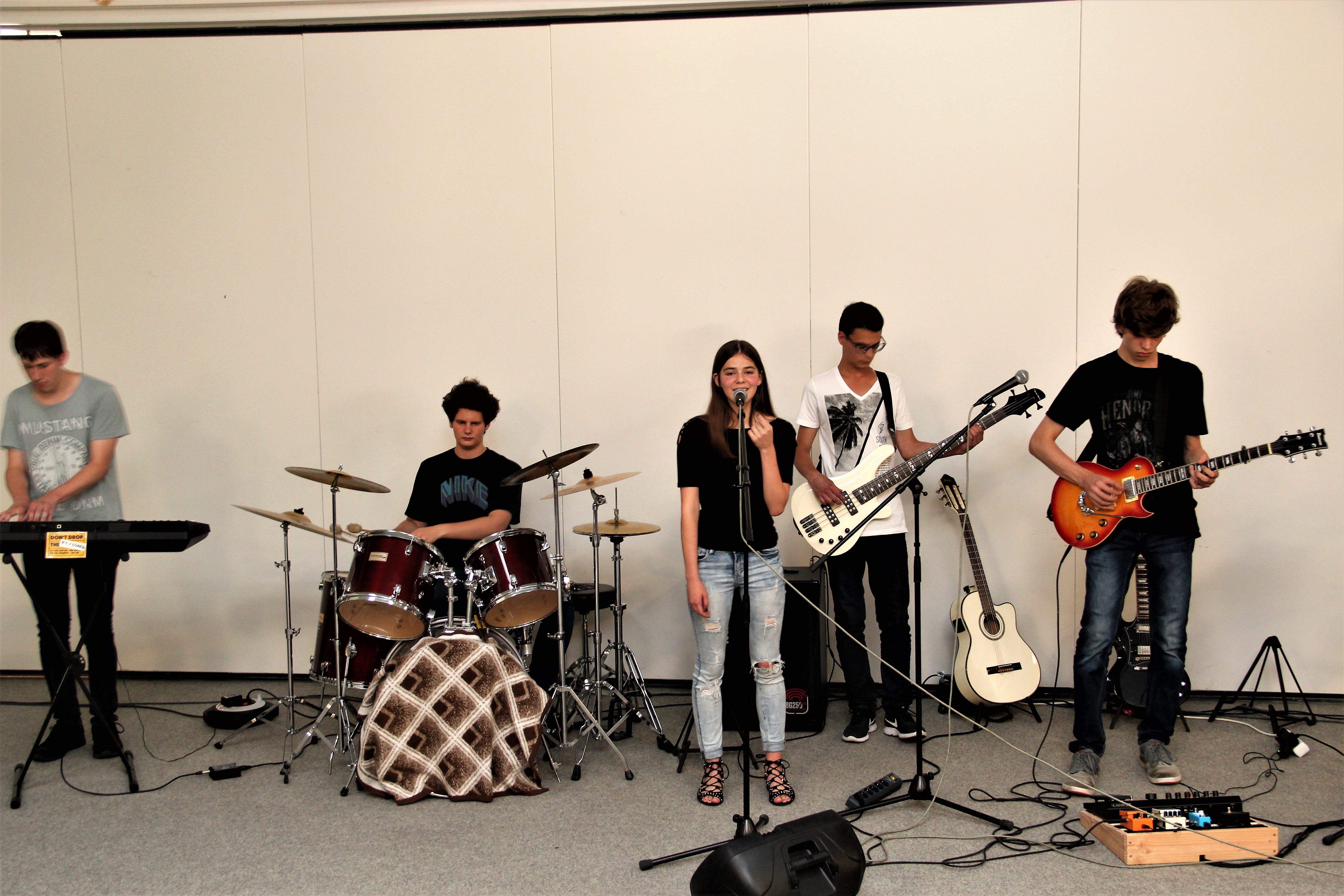 Begeistert waren die Besucher auch von der zweiten Band. Physiklehrer Christian Weichhard an der Gitarre und Schulsozialarbeiterin Katharina Wiedergrün, begleitet von ihrer Schwester Johanna an der Geige und Laura Mößle (Gesang) interpretierten Stücke von Oasis oder Tracy Chapman. Den Schlusspunkt des gelungenen Spendenkonzerts bildete „Another Brick In The Wall“ von „Pink Floyd“, interpretiert vom Schulchor, und „Dusty Basement“.