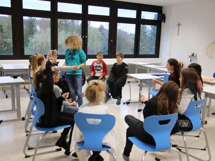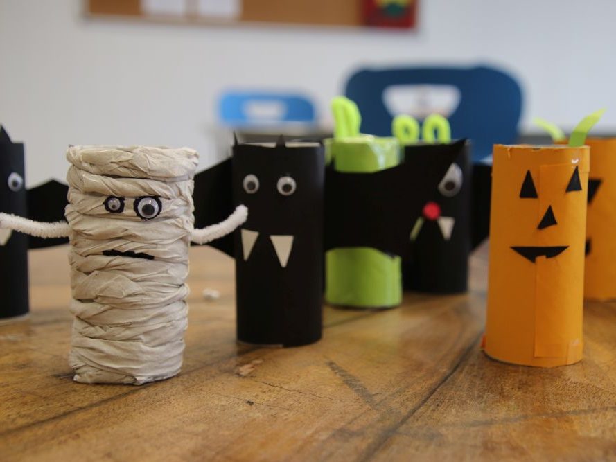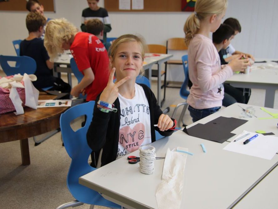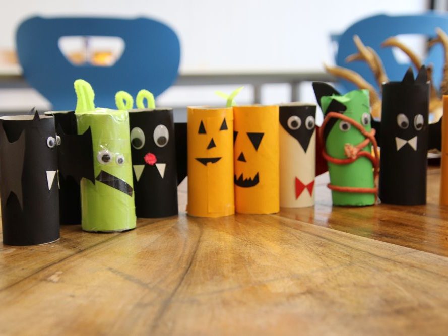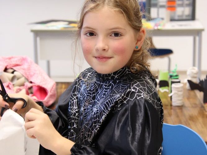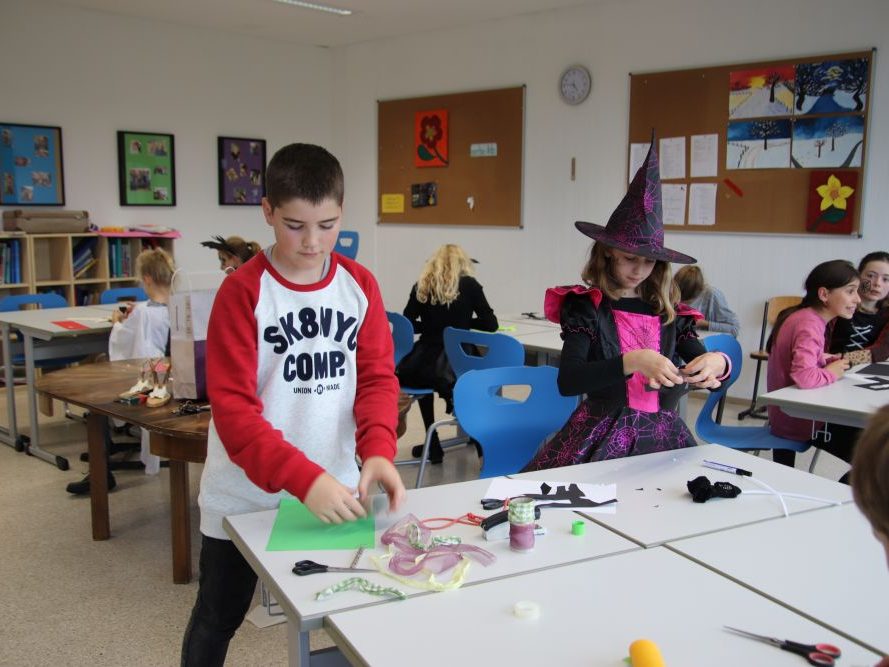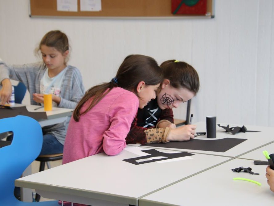 Auch im „verflixten 7. Jahr“ hat die Grusellesenacht am Caspar-Mohr-Progymnasium nichts von ihrem Reiz für die Schülerinnen und Schüler der Klassen 5 und 6 verloren. Das neue Team der Bücherei, Rosalie Bühler, Lisa Härle und Laura Renn aus Klasse 9, hatte sich im Vorfeld bereits mächtig ins Zeug gelegt, um einen gelungenen Grusel-Spiel-und-Spaß-Nachmittag für ihre jüngeren Mitschüler auf die Beine zu stellen. Und die waren dankbar und bester Laune gekommen, um das bewährte Gruselbuffet zu genießen, den Gruselgeschichten zu lauschen, Werwölfe und Black Stories zu spielen und sich durch das geheimnisvolle Labyrinth zu wagen, das extra zu diesem Zweck aufgebaut worden war. Mit tatkräftiger Unterstützung von Johannes Ailinger, Lucia Braun, Lili Britsch, Sven Jaster und Karina Wamsiedel-Moscaliuc wurden die mutigen Unterstufenschüler hier erschreckt und unterhalten. Zur Beruhigung und zum Vergnügen gab es dieses Mal auch wieder eine Bastelaktion, bei der niedliche Halloween-Monster entstanden, die die Kinder fröhlich und stolz präsentierten. Dass sich Halloween nicht nur im Schulhaus sondern auch außerhalb zunehmender Beliebtheit erfreute, sah man nicht zuletzt an den zahlreichen Kostümen, die die Kinder dieses Mal angelegt hatten, um dem Anlass den nötigen Schauer-Glanz zu verleihen.