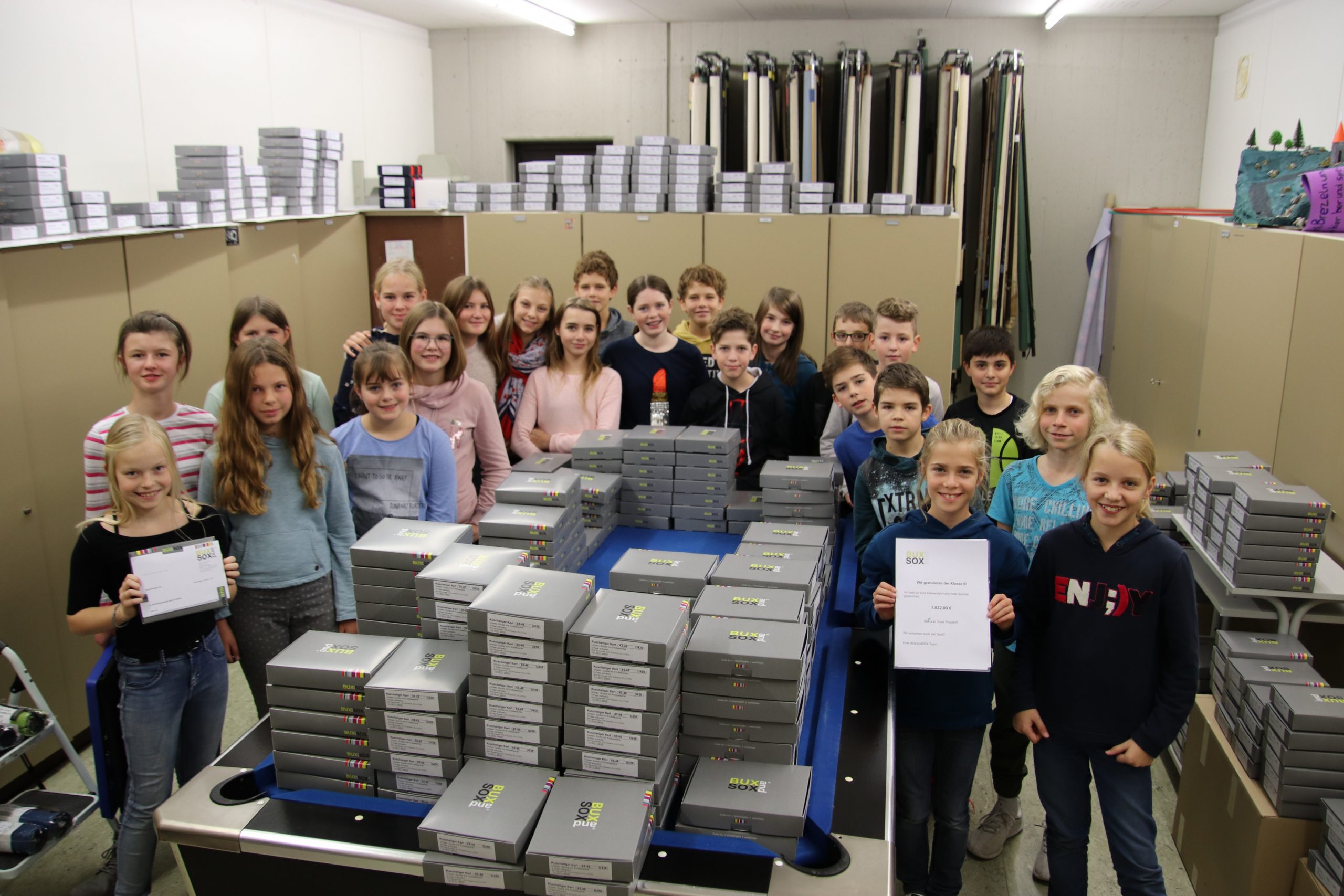 2,5 Wochen lang verkauften die 23 Schüler/-innen mit Musterboxen und Katalog ausgestattet in ihrem Bekannten- und Freundeskreis Sockenboxen bzw. es gab auch Badetücher, Handtücher und Boxershorts im Angebot. Alle waren fleißig unterwegs und verkauften insgesamt 472 Boxen (pro Schüler zwischen 4 – 75 Boxen), für jede verkaufte Box erhielten sie für die Klassenkasse 4 Euro. Somit erhielten sie insgesamt 1888 Euro.