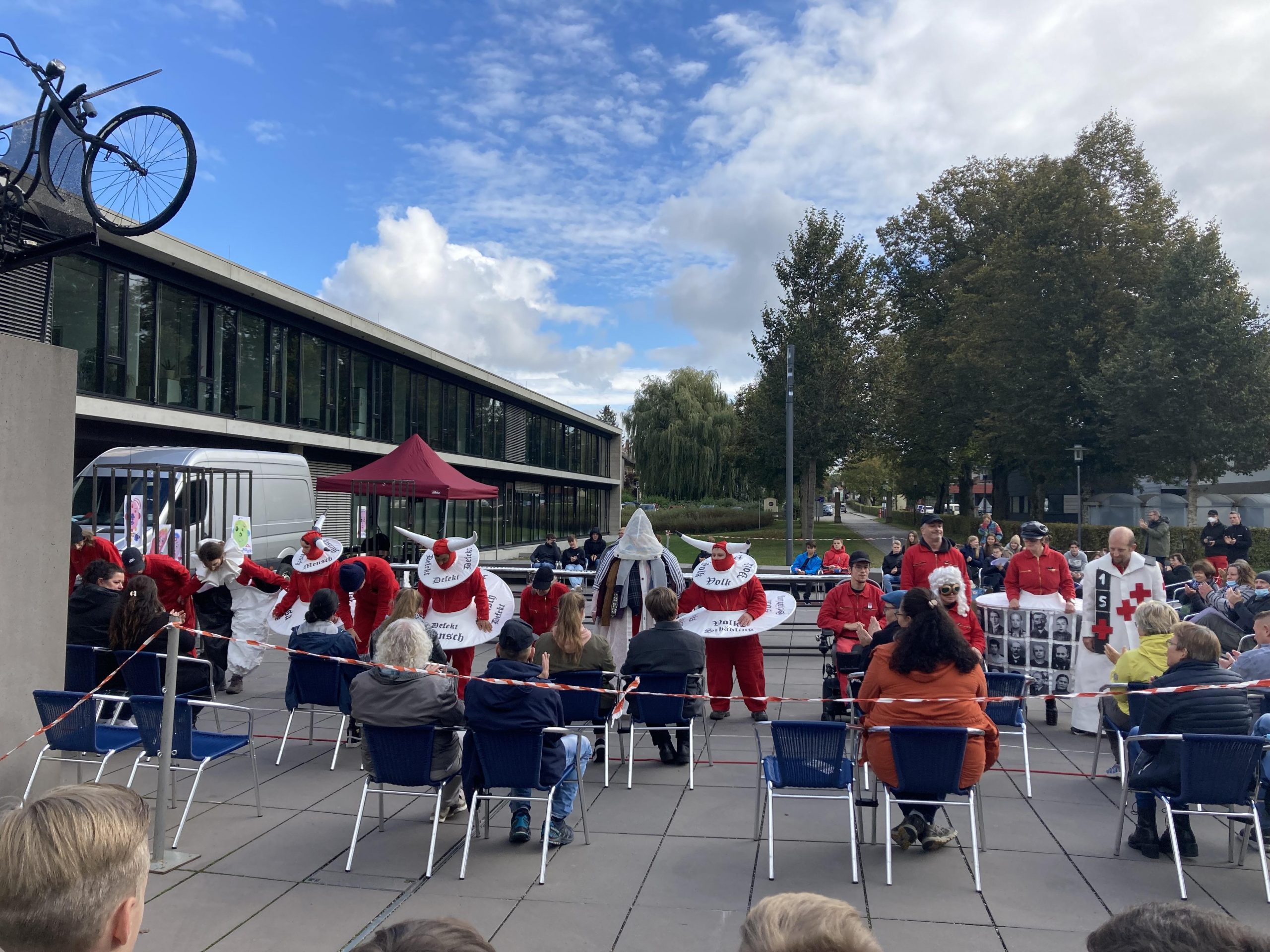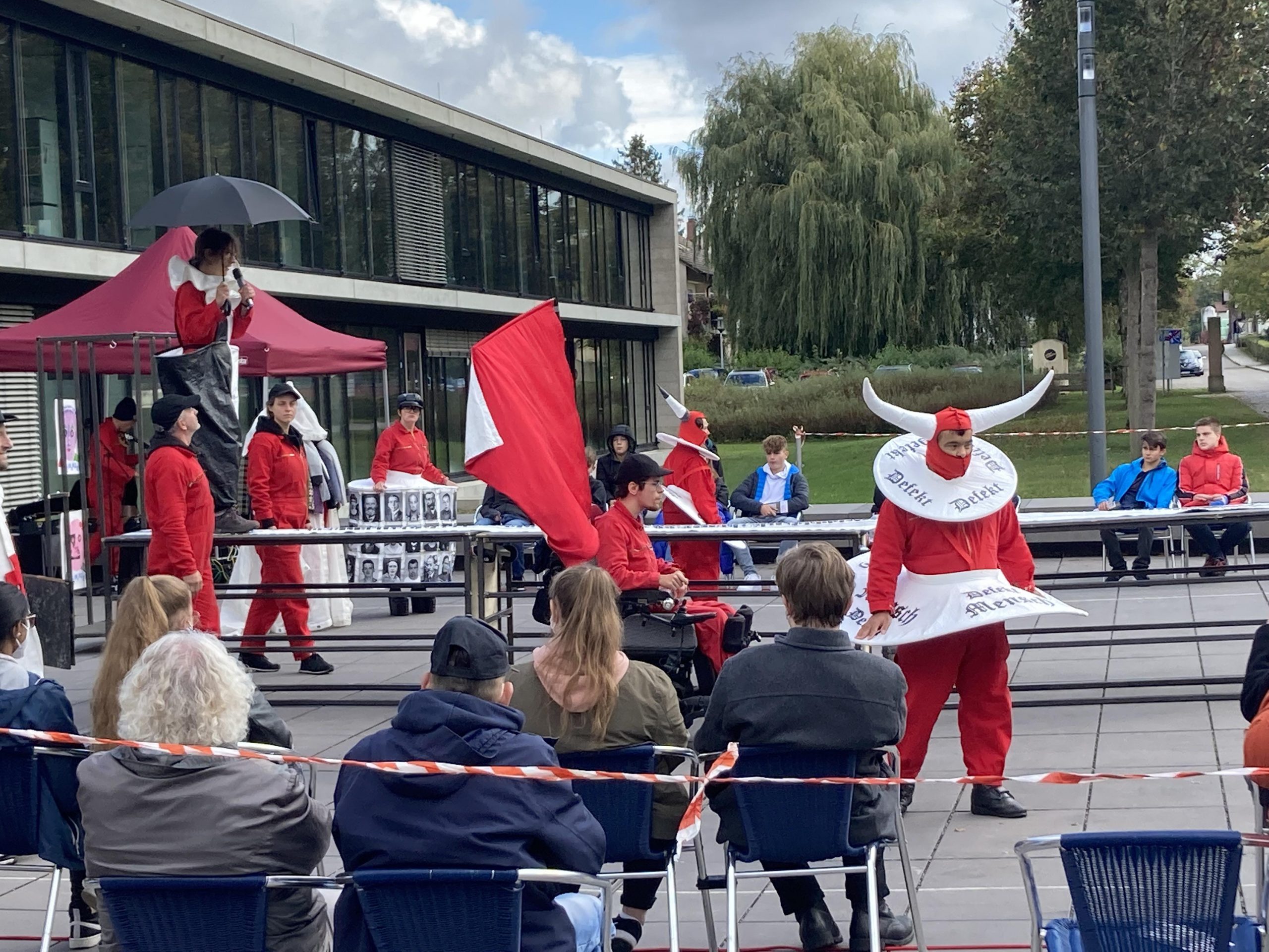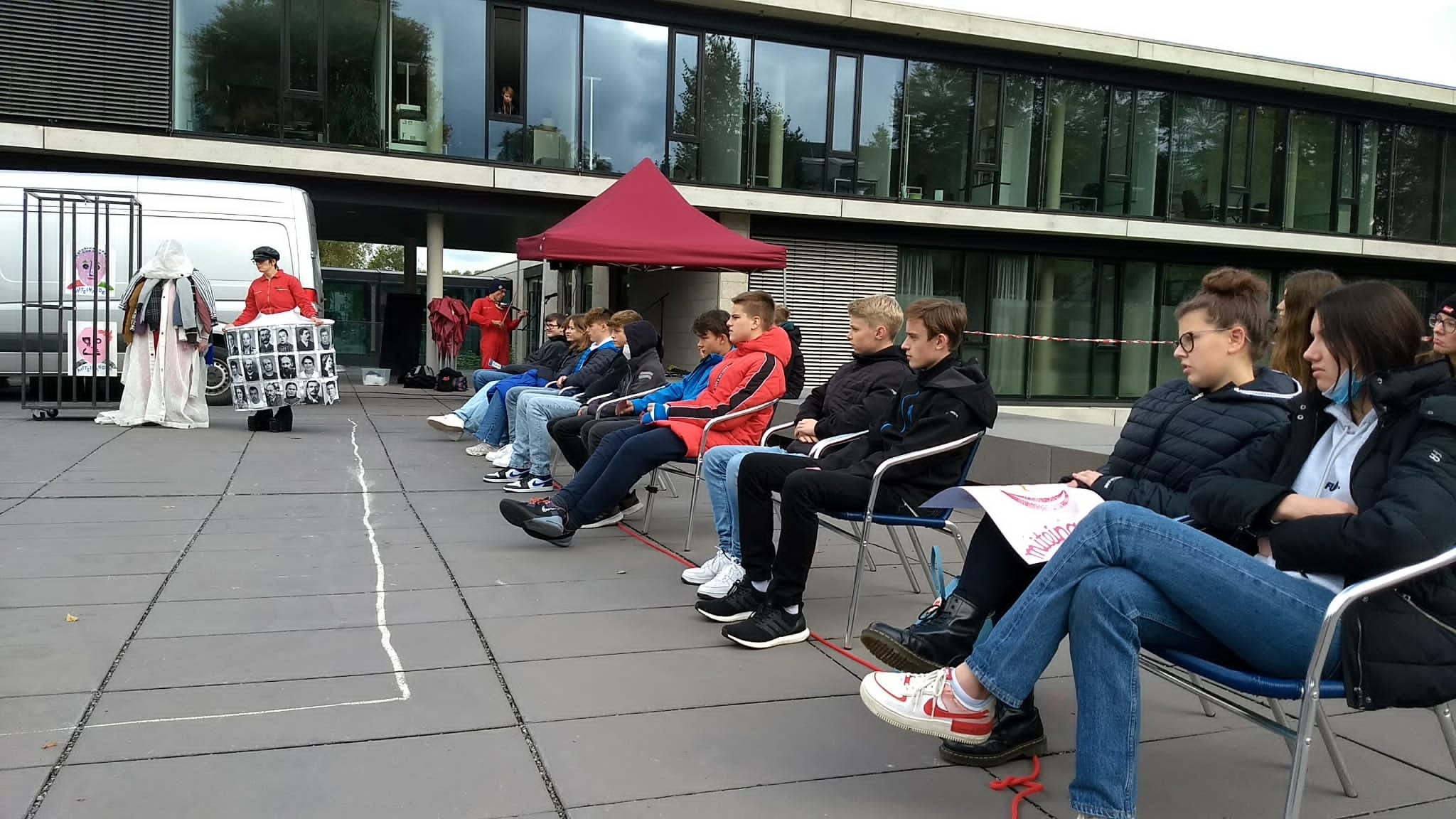 Am Donnerstag, den 07. Oktober 2021 besuchten die Klassen 9 und 10 gemeinsam mit ihren Lehrerinnen Frau Alesi und Frau Wehling eine Theateraufführung unter freiem Himmel. Bei der Vorstellung des inklusiven Ensembles vom Reutlinger Tonne-Theater wurden unter dem Titel „Hierbleiben… Spuren nach Grafeneck“ die Deportationen von Menschen mit geistigen und körperlichen Behinderungen zu Zeiten des Nationalsozialismus thematisiert. Mit ihrem Programm besuchte das Ensemble verschiedene Orte in ganz Baden-Württemberg, unter anderem eben auch Bad Schussenried. Denn auch von Bad Schussenried aus brachten die sogenannten „grauen Busse“ die Betroffenen zum Schloss Grafeneck, wo sie unmittelbar nach ihrer Ankunft ermordet wurden.
