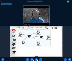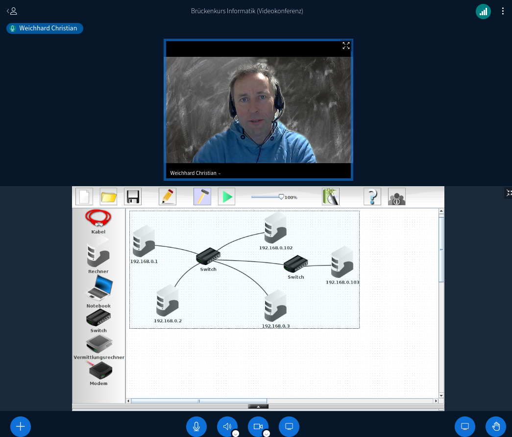So wurden es insgesamt 13 Schülerinnen und Schüler aus den Klassen 9 und 10 vom Progymnasium Bad Buchau und dem Progymnasium Altshausen sowie vom Caspar-Mohr-Progymnasium Bad Schussenried, die regelmäßig teilnahmen. Wir haben uns jeden Dienstag von 19:00 bis 20:30 zur Videokonferenz getroffen. Es wurde erklärt, besprochen, gefragt, geübt, programmiert oder auch mit einem Simulationsprogramm für Netzwerke gearbeitet. Auf der Lernplattform Moodle lag das gesamte Material und auch die übrige Kommunikation lief darüber ab.