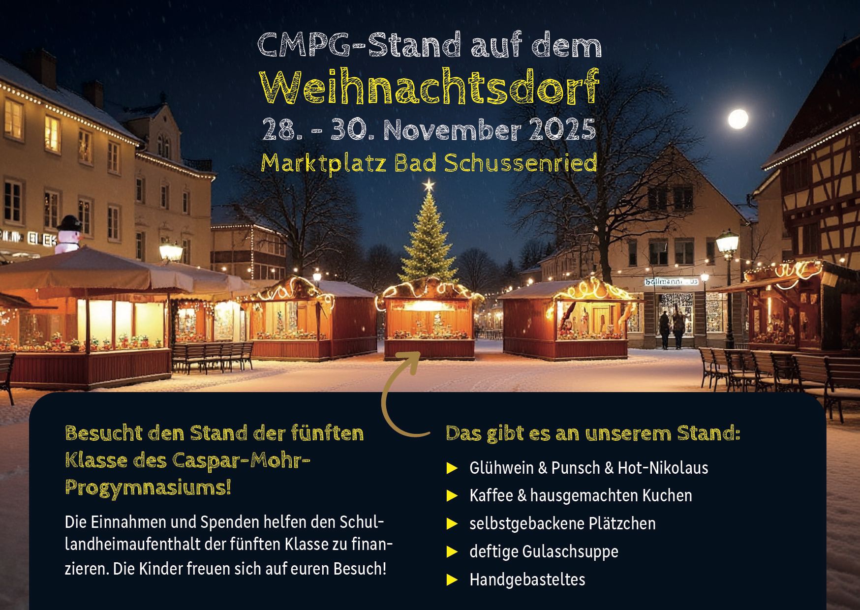 Klasse 5 auf dem Weihnachtsmarkt Von Stefanie Baisch 27. November 2025 0 In jedem Jahr vertritt eine Klasse das CMPG auf dem Weihnachtsdorf. In diesem Jahr laden die Schülerinnen und Schüler unserer Klasse 5 zusammen mit ihren Eltern herzlich ein!